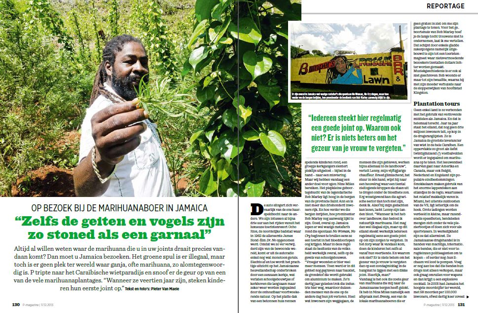 P-Magazine: ‘Op bezoek bij de marihuanaboer’ door Pieter Van Maele op dec 17, 201315 oktober 2014 Medio 2013 trok ik voor het Belgische P-Magazine naar Nine Miles, het geboortedorp van Bob Marley op Jamaica. Delen: Klik om te delen op X (Opent in een nieuw venster) X Klik om te delen op Facebook (Opent in een nieuw venster) Facebook Vind-ik-leuk Aan het laden... Gerelateerd Berichtnavigatie Vorige: De Standaard: ‘Ondertussen op Haïti’Volgende: Skipr: ‘Personeel is hier niet te vinden’