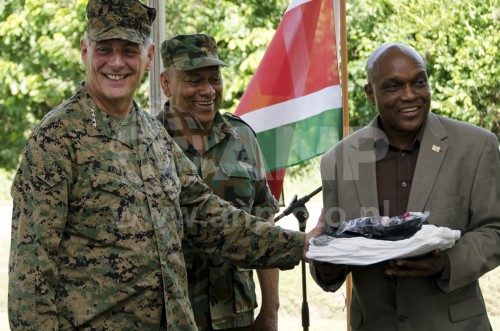 Bevelhebber van het US Southern Command John F. Kelly schenkt anti-ebolapakketten aan het Surinaamse leger. De VS komt daarmee tegemoet aan de oproep van president Desi Bouterse, die eerder zei hulp van de VS tegen ebola te verwelkomen.