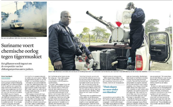 Een oorverdovend gebrom als een op hol geslagen propellervliegtuig, gevolgd door een ondoordringbare wolk van gif die over woonerven, langs vluchtende bromfietsers en dwars door woonkamers van Paramaribo waait. De nevel trekt snel op, maar een chemische knoflookstank blijft nog uren hangen. Het gifkanon wordt ingezet om de verspreider van het chikungunyavirus aan te pakken.
