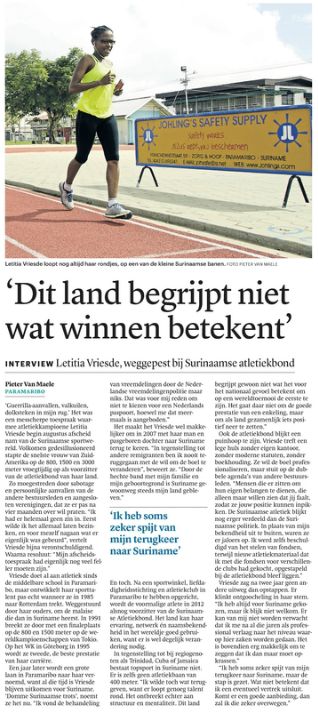 ‘Guerrilla-aanvallen, valkuilen, dolksteken in mijn rug.’ Het was een messcherpe toespraak waarmee atletiekkampioene Letitia Vriesde begin augustus afscheid nam van de Surinaamse sportwereld. Volkomen gedesillusioneerd stapte de snelste vrouw van Zuid-Amerika op de 800, 1500 en 3000 meter vroegtijdig op als voorzitter van de atletiekbond van haar land.