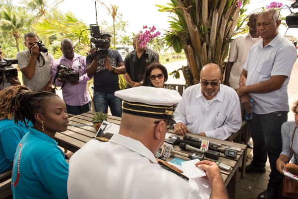 President Desi Bouterse heeft zijn stemkaart ontvangen van de districtscommissaris van Paramaribo in de tuin van zijn huis. Met de stemkaart kan hij op 25 mei zijn stem uitbrengen voor de parlementsverkiezingen van Suriname.