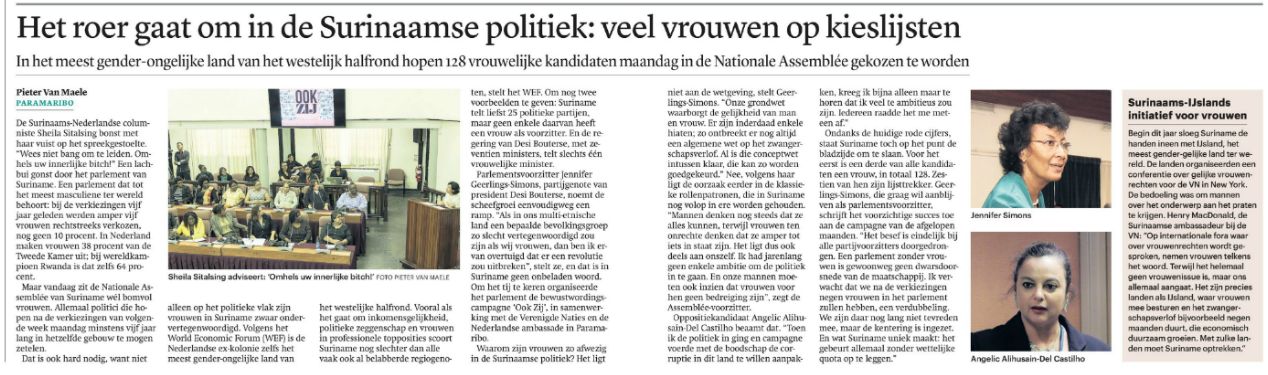 De Surinaams-Nederlandse columniste Sheila Sitalsing bonst met haar vuist op het spreekgestoelte. “Wees niet bang om te leiden. Omhels uw innerlijke bitch!” Een lachbui gonst door het parlement van Suriname. Een parlement dat tot het meest masculiene ter wereld behoort: bij de verkiezingen vijf jaar geleden werden amper vijf vrouwen rechtstreeks verkozen, nog geen 10 procent. In Nederland maken vrouwen 38 procent van de Tweede Kamer uit; bij wereldkampioen Rwanda is dat zelfs 64 procent.